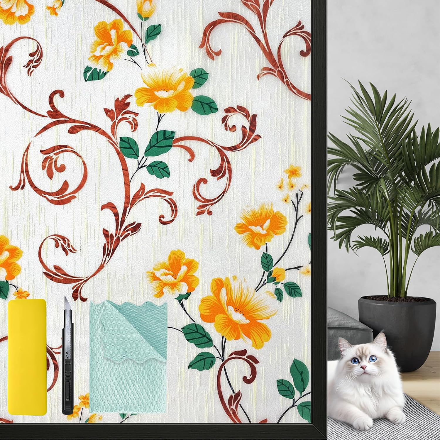 Niviy Stained Glass Window Privacy Film with Installation Tools, 3D Frosted Glass Window Decals UV Protection Sun Blocking Static Clings Non Adhesive Glass Stickers for Home 17.5 x 118 inch