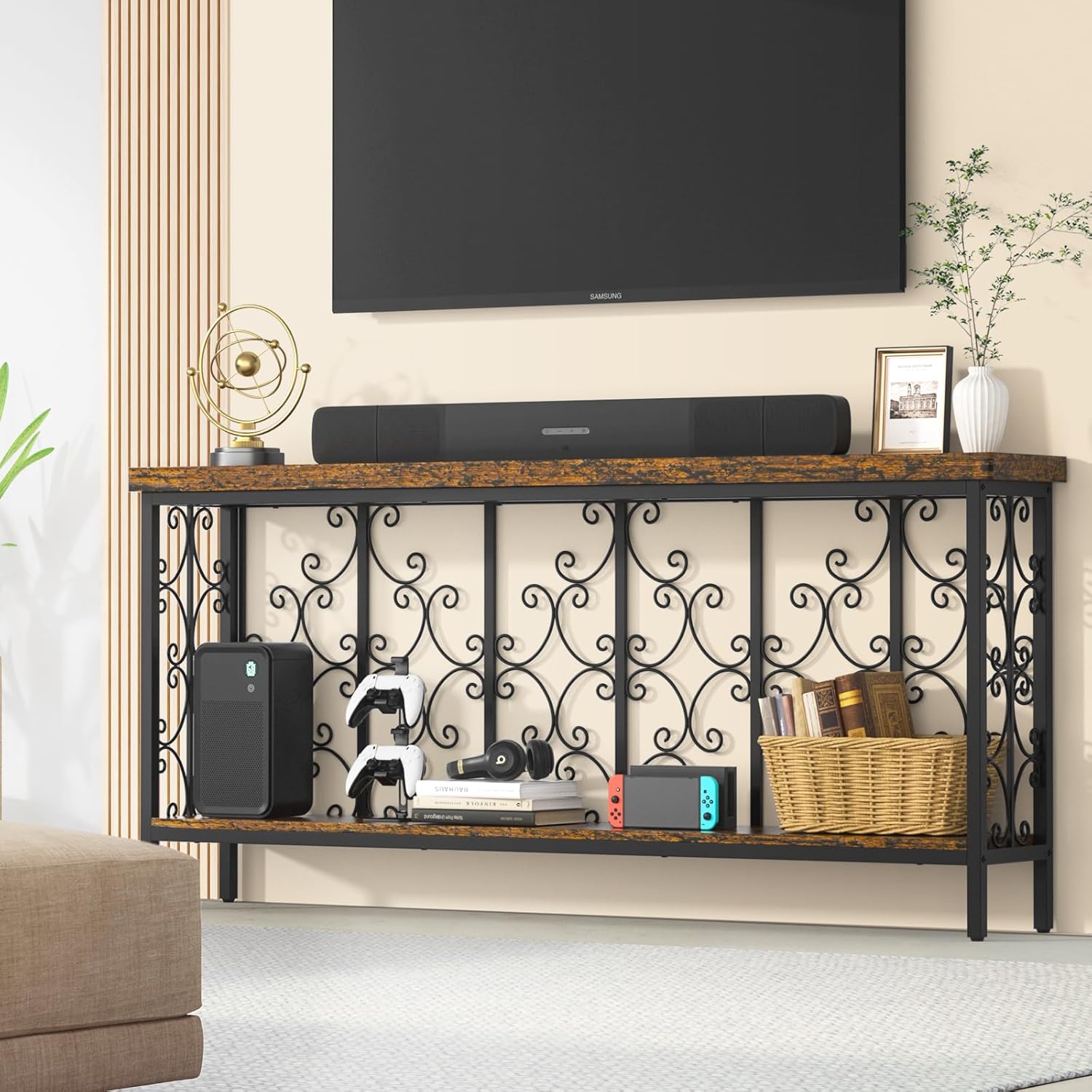 ikkle 70.9" Extra Long Console Table, Industrial Narrow Sofa Table Behind Couch with 2 Tier Storage Shelf, Entryway Hallway Accent Table for Living Room, Foyer, Rustic Brown