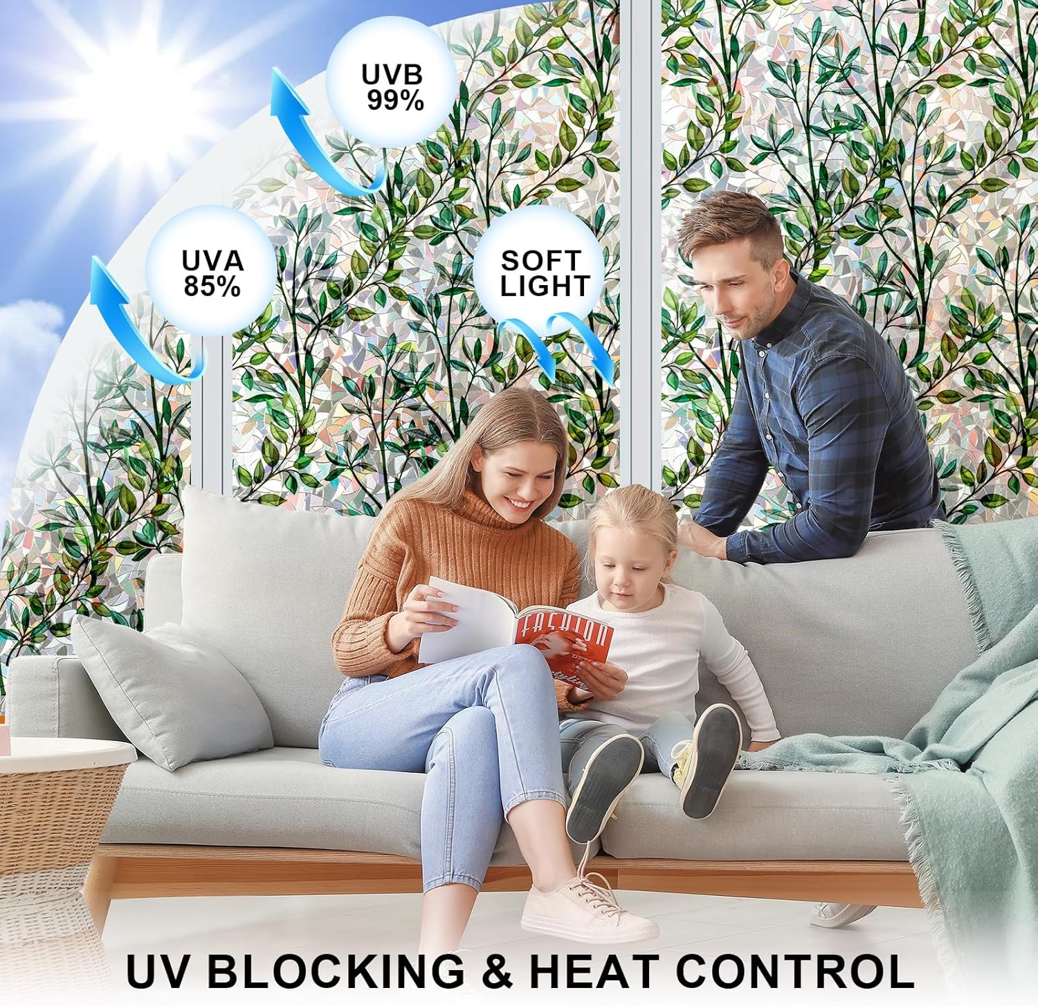 Rainbow Window Privacy Film 3D Leaf Decorative Stained Glass Window Film Anti UV Non-Adhesive Reusable 17.5" x 157.4" for Home Room Car Glass Cling