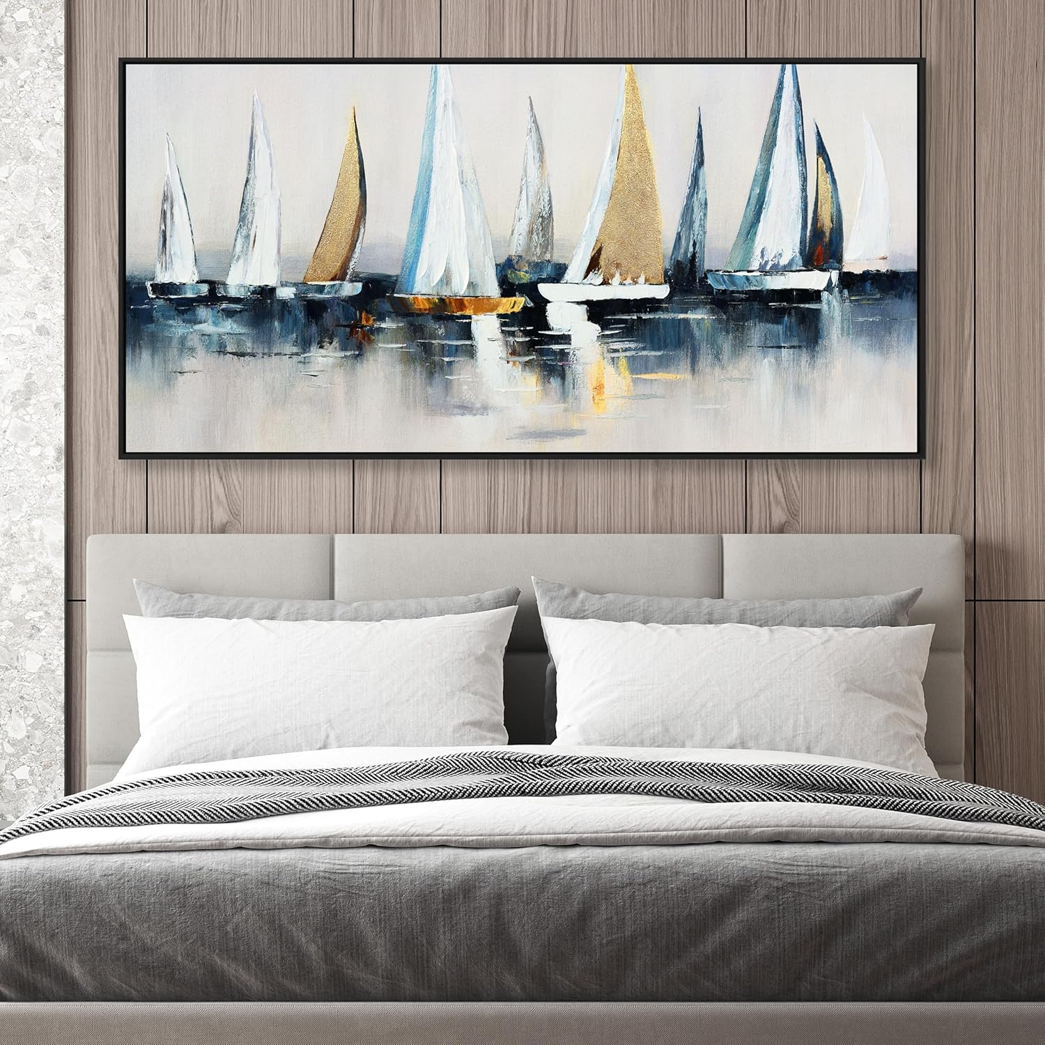 Abstract Wall Art Blue and White Sailboat Wall Paintings Framed Artwork for Living Room Bedroom Bathroom Office Home Decor Can Be Hung Directly 24"x 48"