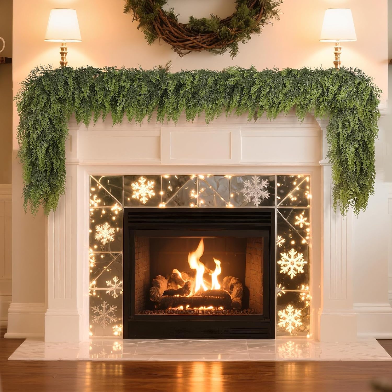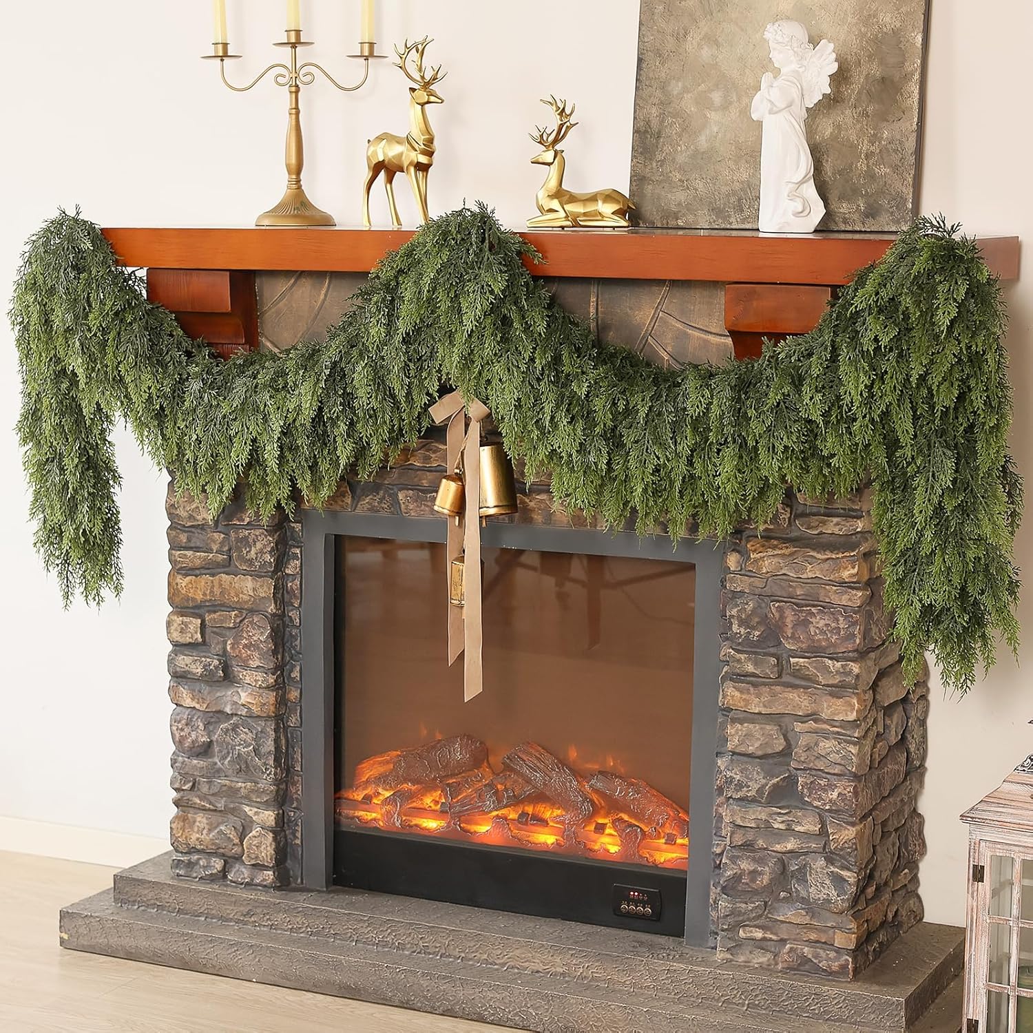 - Realistic Christmas Garland - The cedar garland is very lush. We used more materials. Compared with ordinary garlands, they are denser and have a more realistic touch. As shown in the picture, a cedar garland can give your fireplace a plump and fluffy effect, making your Christmas decoration more convenient.
