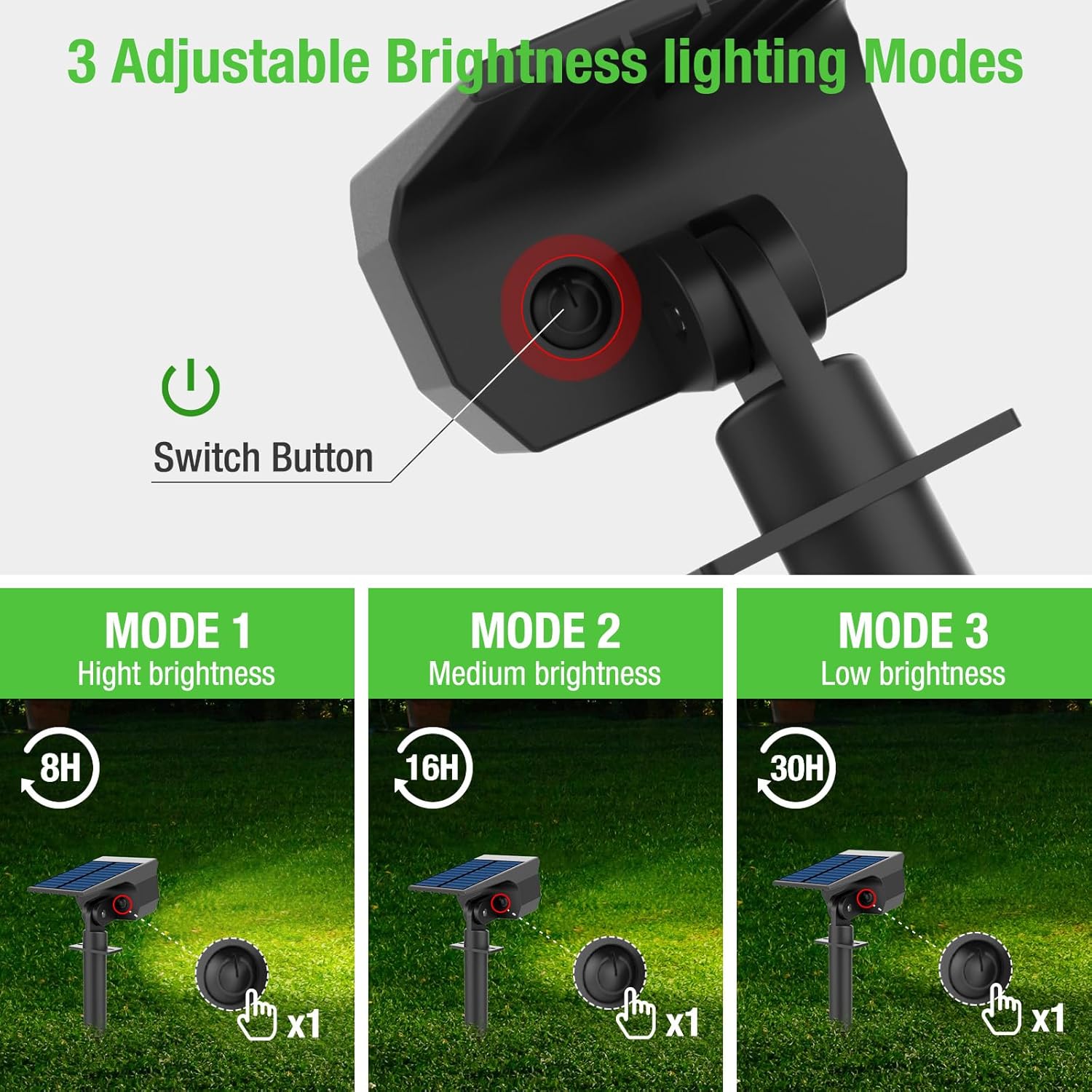 - 3 Lighting Modes & Motion Sensor: Solar spotlights have a built-in sensitive PIR motion sensor, which can easily capture motion. There are 3 modes:1.[Sensor light mode]: full brightness when the motion is detected,close when no motion 2.[Dim light sensor mode]:low brightness no motion,full brightness when the motion is detected 3.[ Constant light mode]: auto power on at night, auto power off during the day