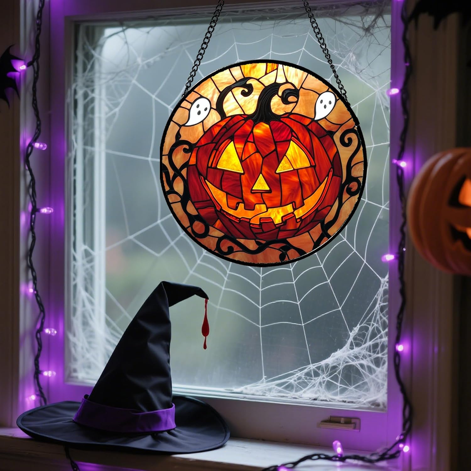 Stained Glass Window Hanging - Halloween Decorations Evil Pumpkin Orange Suncatcher for Doors Garden Indoor Funny Spooky Sun Catchers Gothic Decor Horror Gifts for Women Men Friend 9.8 in