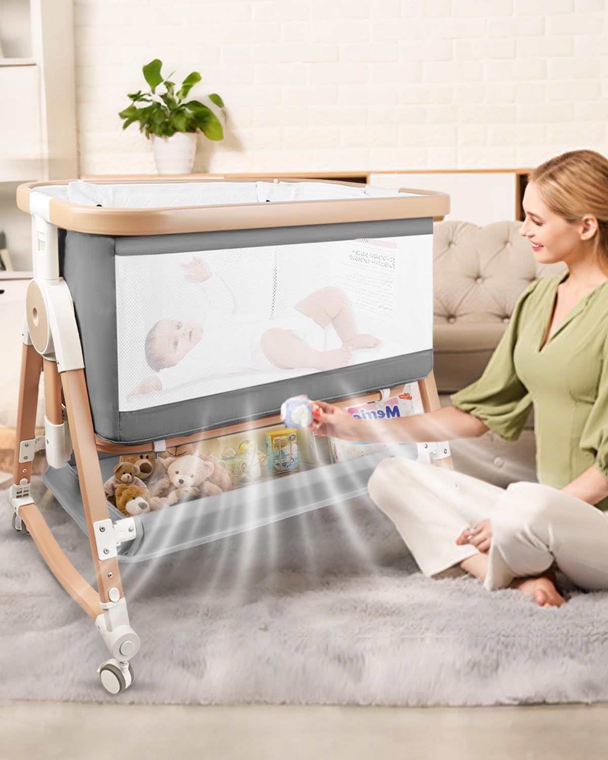 4 in 1 Baby Bassinet, Bassinets Bedside Sleeper with Wheels and Storage Basket, Adjustable 7 Heights Bedside Sleeper with Mosquito Net, Breathable Mesh Rocking Bassinet for Baby (Grey)