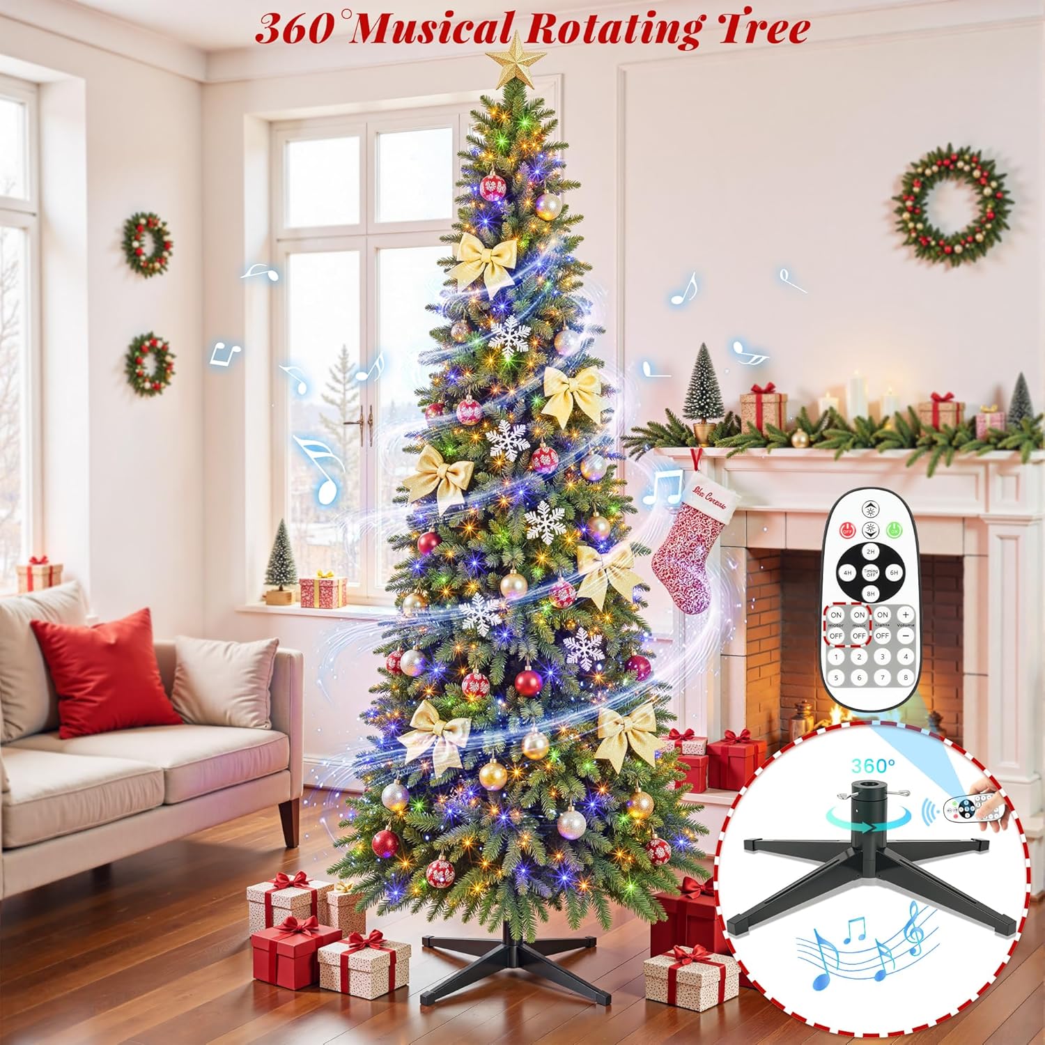 - 360 Degree Rotation with Music: Motorized base displays ornaments evenly.