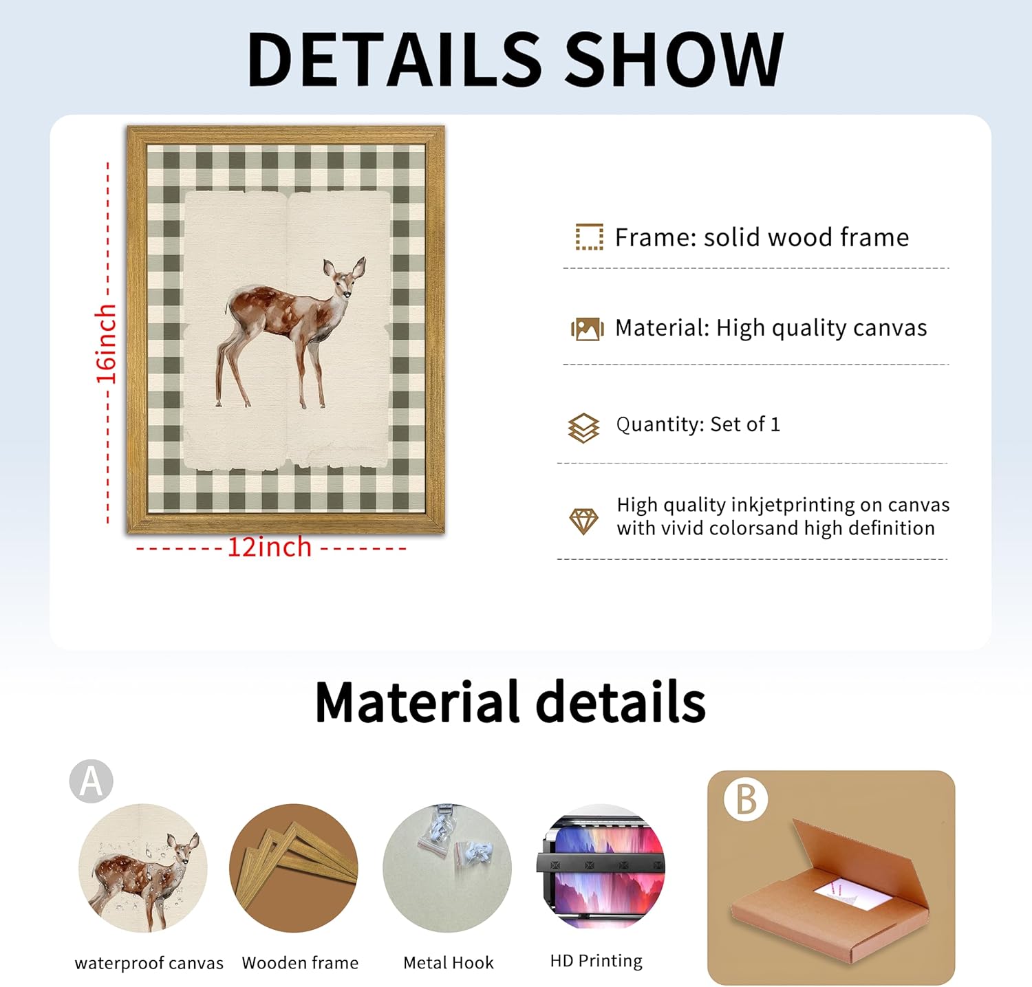 Wood Framed Deer Wall Art Print, Woodland Baby Deer Canvas Poster Wall Decor, Vintage Rustic Green Gingham Farmhouse Animal Picture for Living Room Kitchen Bedroom Nursery Decor, 12x16 inch