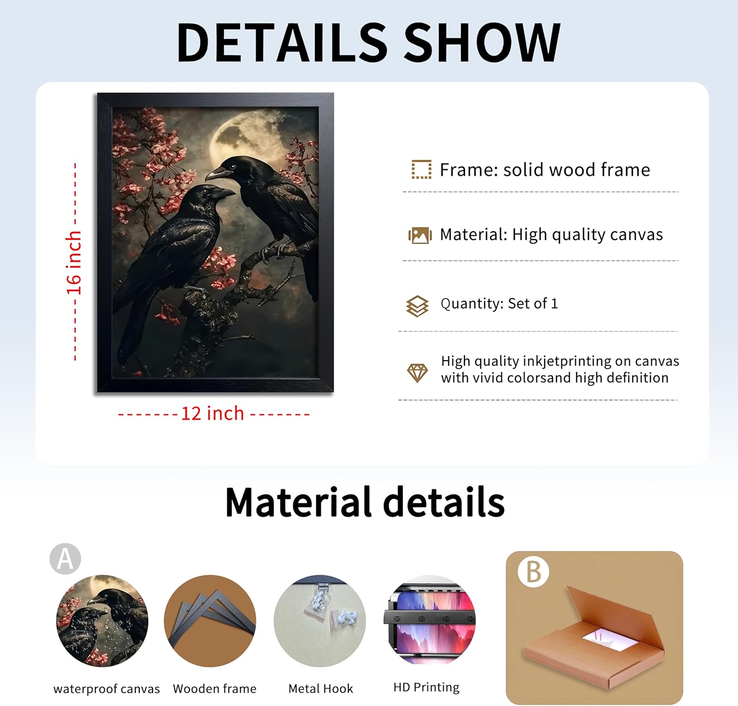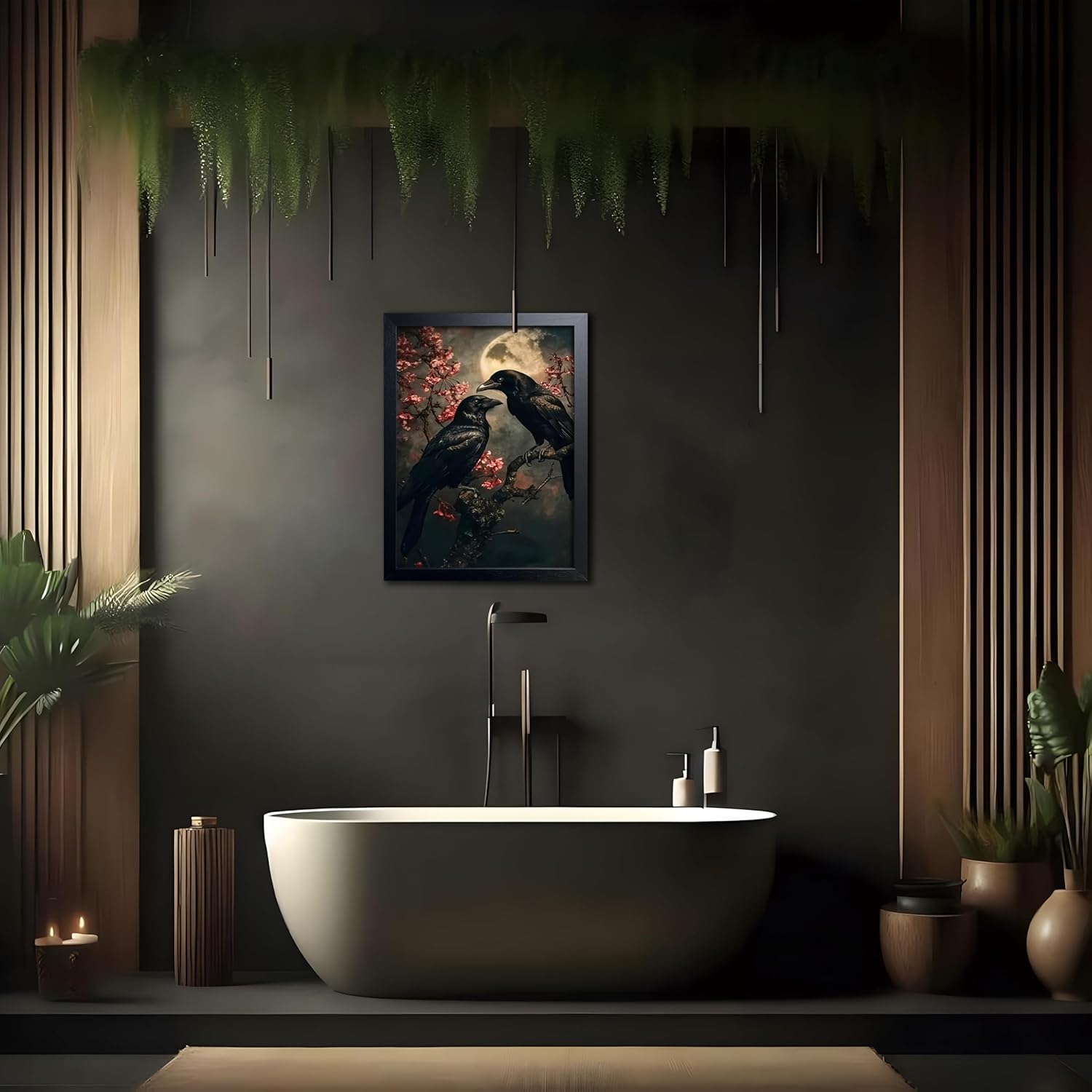 - Gothic Halloween Wall Art-This Black Wood Framed Halloween Canvas Wall Art features a vintage black crow resting among soft cherry blossoms, creating a striking contrast of dark mystery and delicate grace. A perfect piece for fans of gothic decor, dark academia, and nature-inspired art.