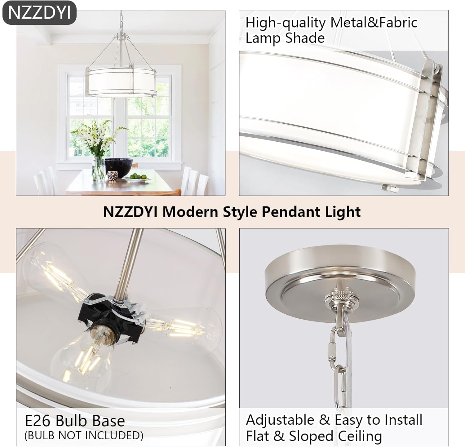 - 【Modern Drum Chandelier】Transform your space with the brushed nickel drum pendant lights,a sleek fusion of modern and classic styles.Featuring a brushed nickel metal frame and white fabric shade,it casts a gentle,eye-friendly glow.This drum chandelier is Ideal for kitchen island,dining rooms,living room or bedroom,adding a touch of warmth and elegance to any decor