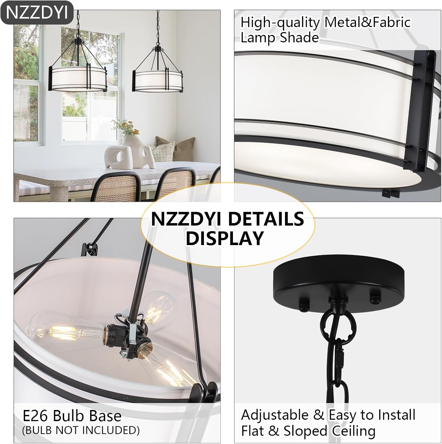 - 【Modern Drum Chandelier】Transform your space with the black farmhouse pendant lights,a sleek fusion of modern and classic styles.Featuring a brushed nickel metal frame and white fabric shade,it casts a gentle,eye-friendly glow.This drum chandelier is Ideal for kitchen island,dining rooms,living room or bedroom,adding a touch of warmth and elegance to any decor