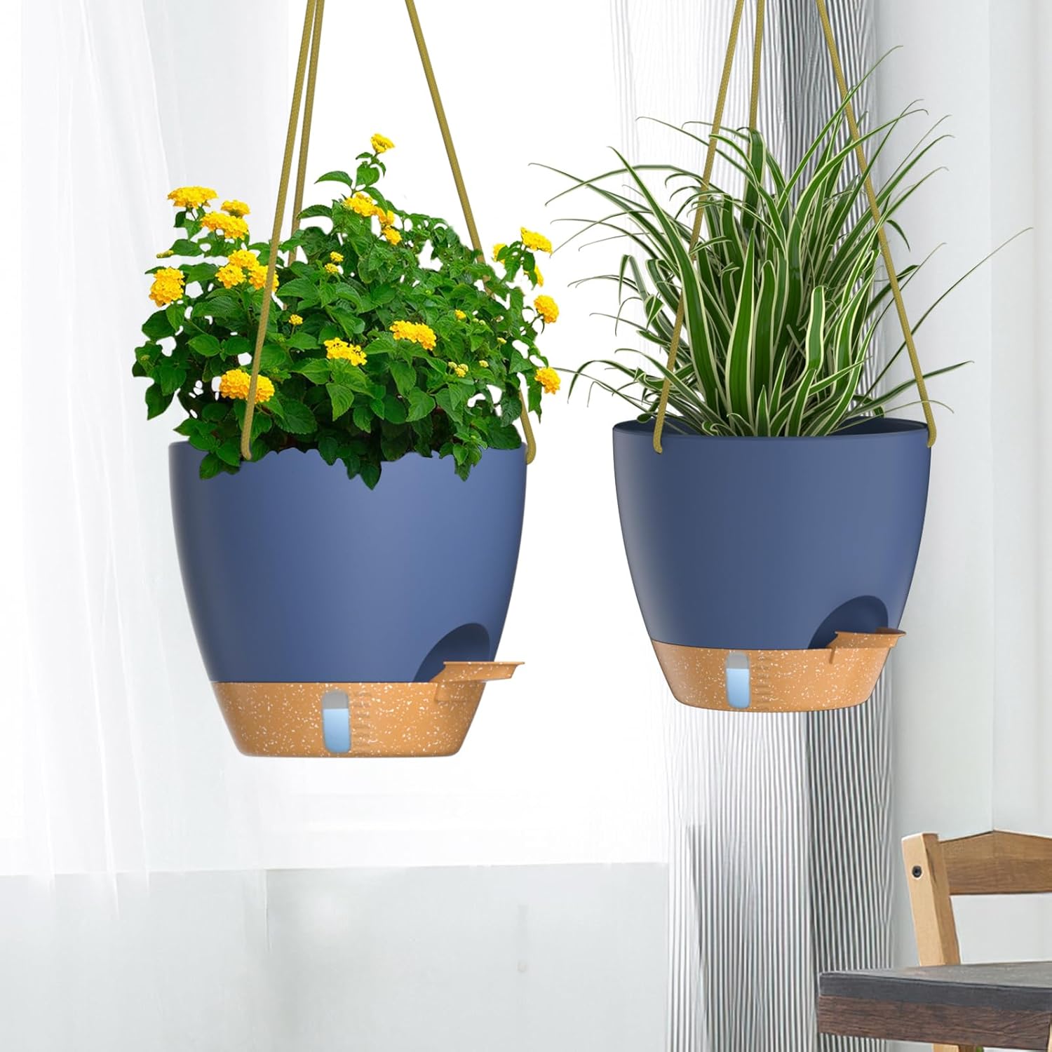 ZMTECH 10 Inch Hanging Planters for Indoor Outdoor Plants, 2 Pack Self Watering Hanging Plant Pots with Drainage Holes and Removable Saucer, Plastic Flower Hanging Pots with Watering Lip (Blue)