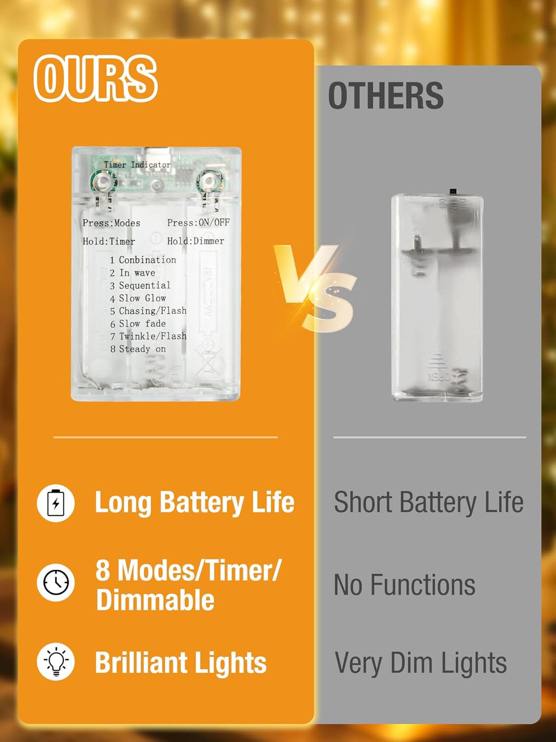 - 8 Modes and Dimmable Fairy Lights : Fairy lights battery operated is equipped with a dual-button switch—the left button switches between 8 lighting modes (combination/wave/sequential, etc.) The right button turns the string lights on or off with a single click, and a long press allows for seamless brightness adjustment to suit your mood and needs. Fairy lights have a memory function, eliminating the need for repeated settings and saving time and effort