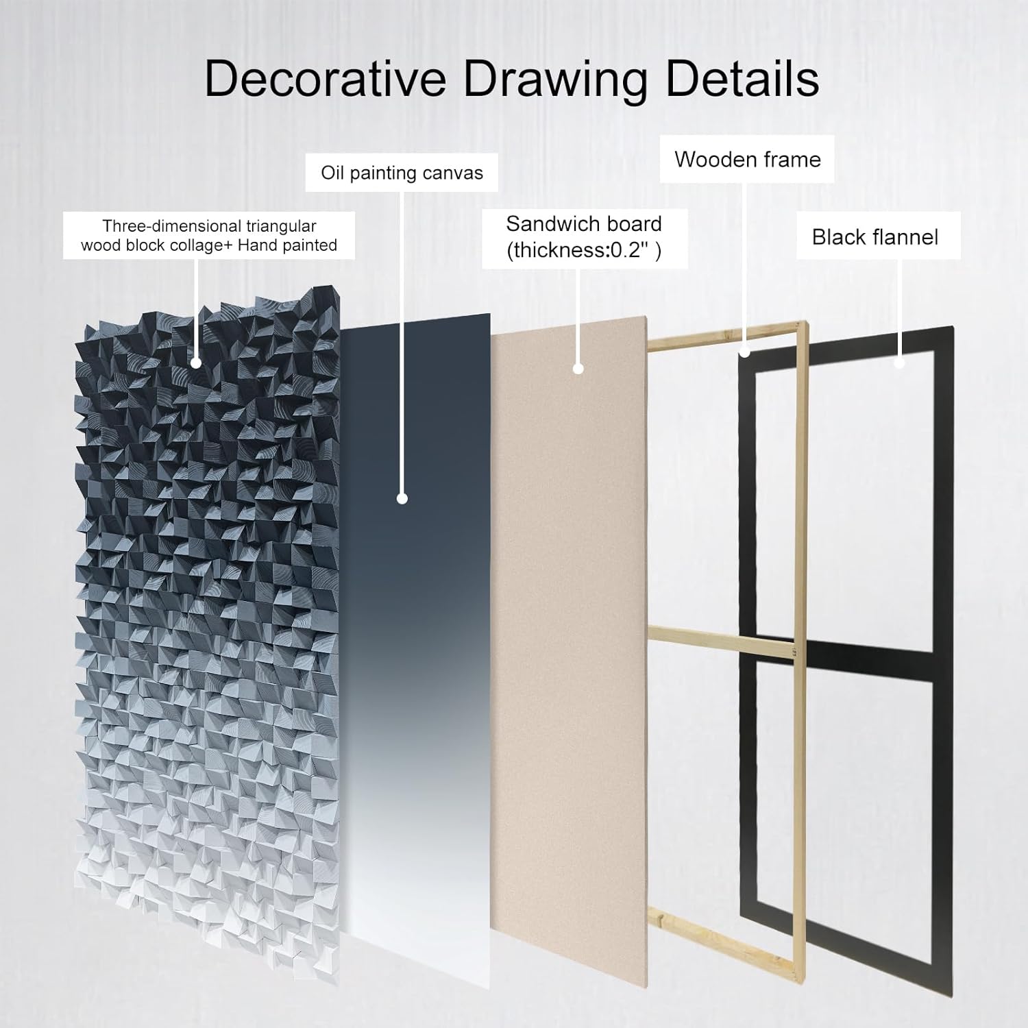 - Eye catching exterior dimensions: This decorative wall panel measures 31.5 x63 inches, perfectly sized to quickly capture attention. Its surface is composed of numerous triangular pine blocks forming a unique array, and the blue and white gradient color transitions from deep blues to pure white, like the fusion of sky and sea of clouds, injecting freshness and vitality into the space.
