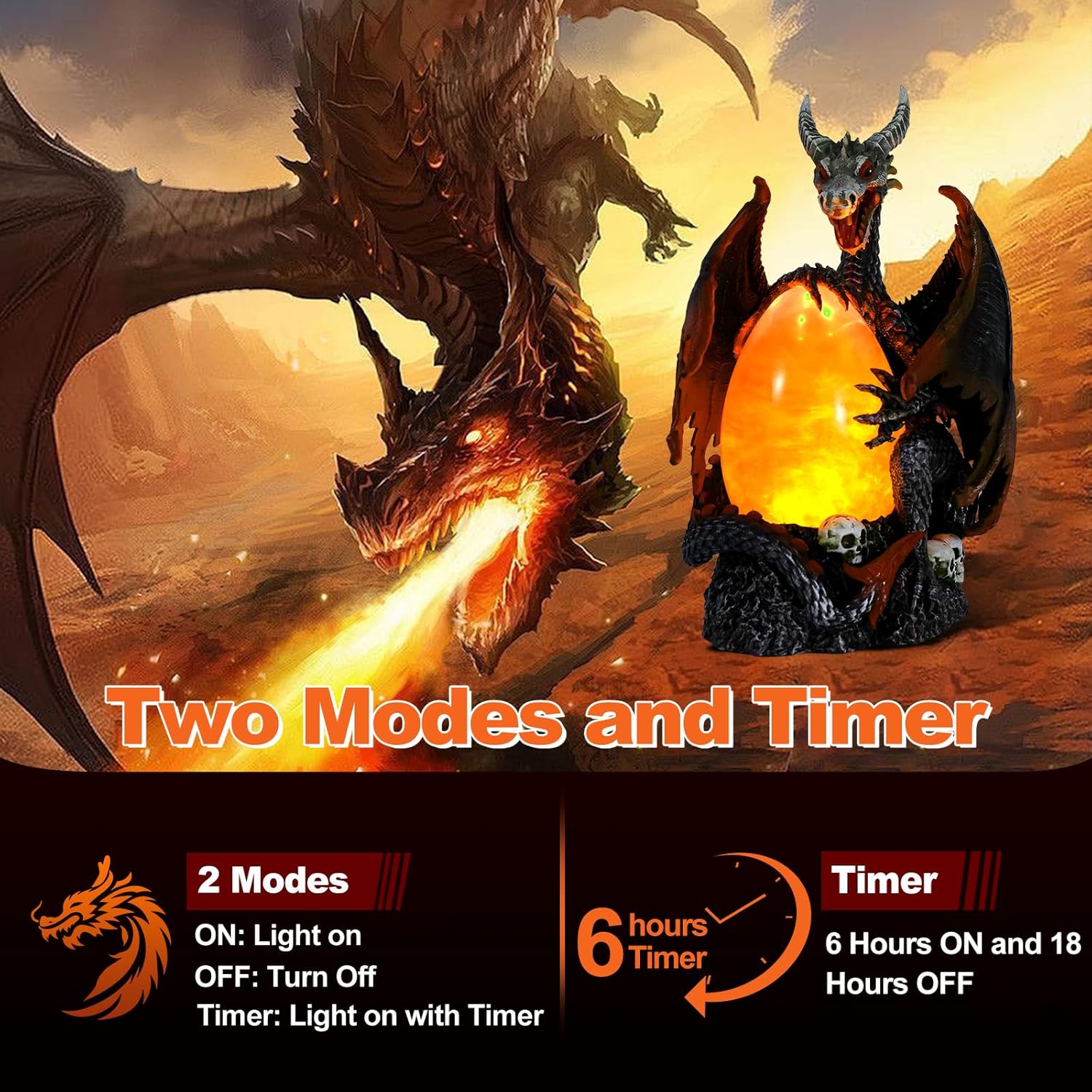 - Convenient Timer for Daily Use: No need to remember to turn dragon night lamp off, this statue includes a 6-hour auto-on and 18-hour auto-off cycle, making skull and dragon statues ideal for nighttime ambiance, themed parties, or display shelves. The smart function helps preserve battery life while keeping your decor lively.