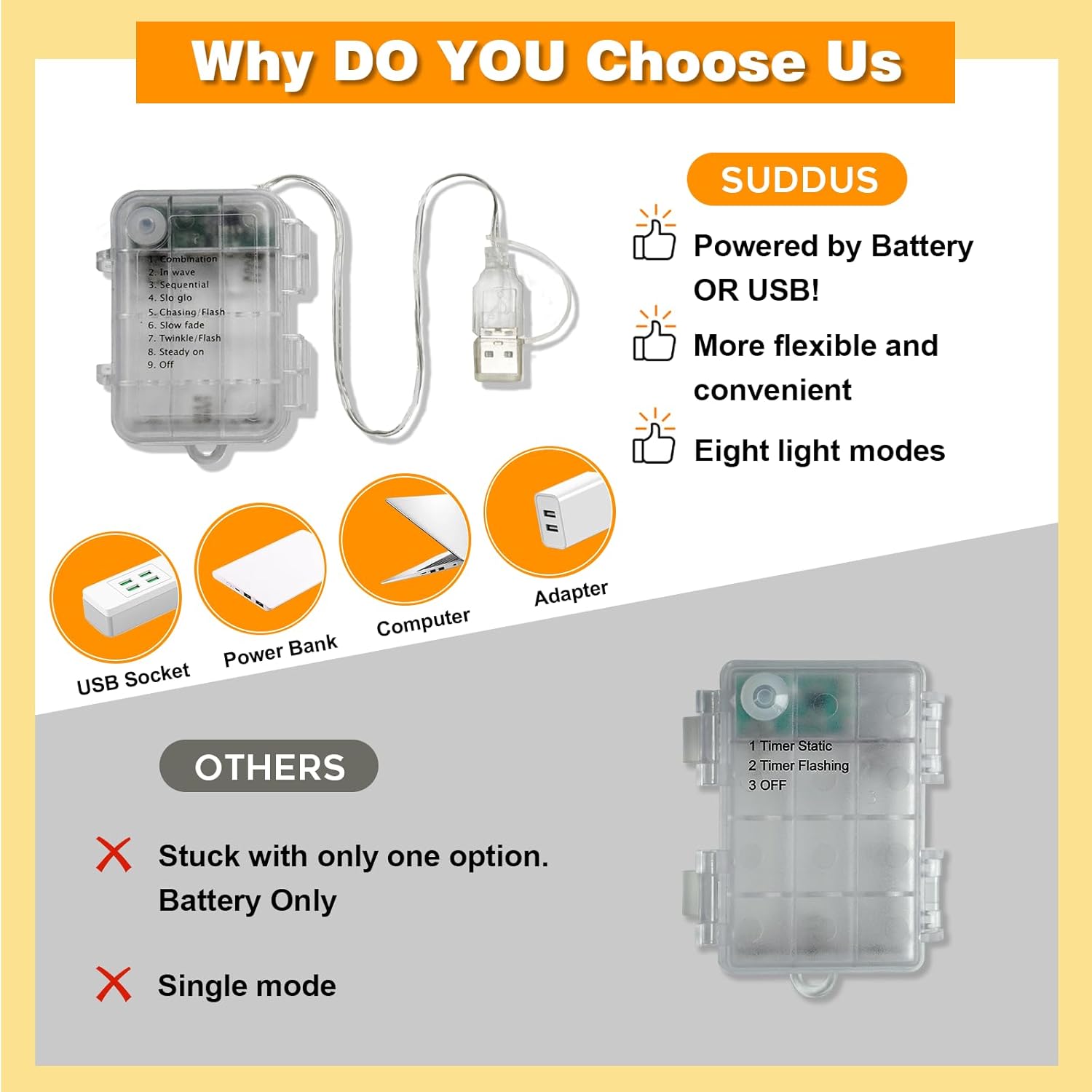 - [DUAL POWER FREEDOM: USB + BATTERY]:No outlets by the nursery corner? Hosting outdoor parties? Our versatile fairy lights solve it all with a 2-in-1 power system. Plug into USB for a continuous glow or use batteries (3xAA not included) for a completely cordless setup. Now you can decorate gardens, weddings, or balcony cafes without limitations—unlike restrictive single-power fairy string lights.