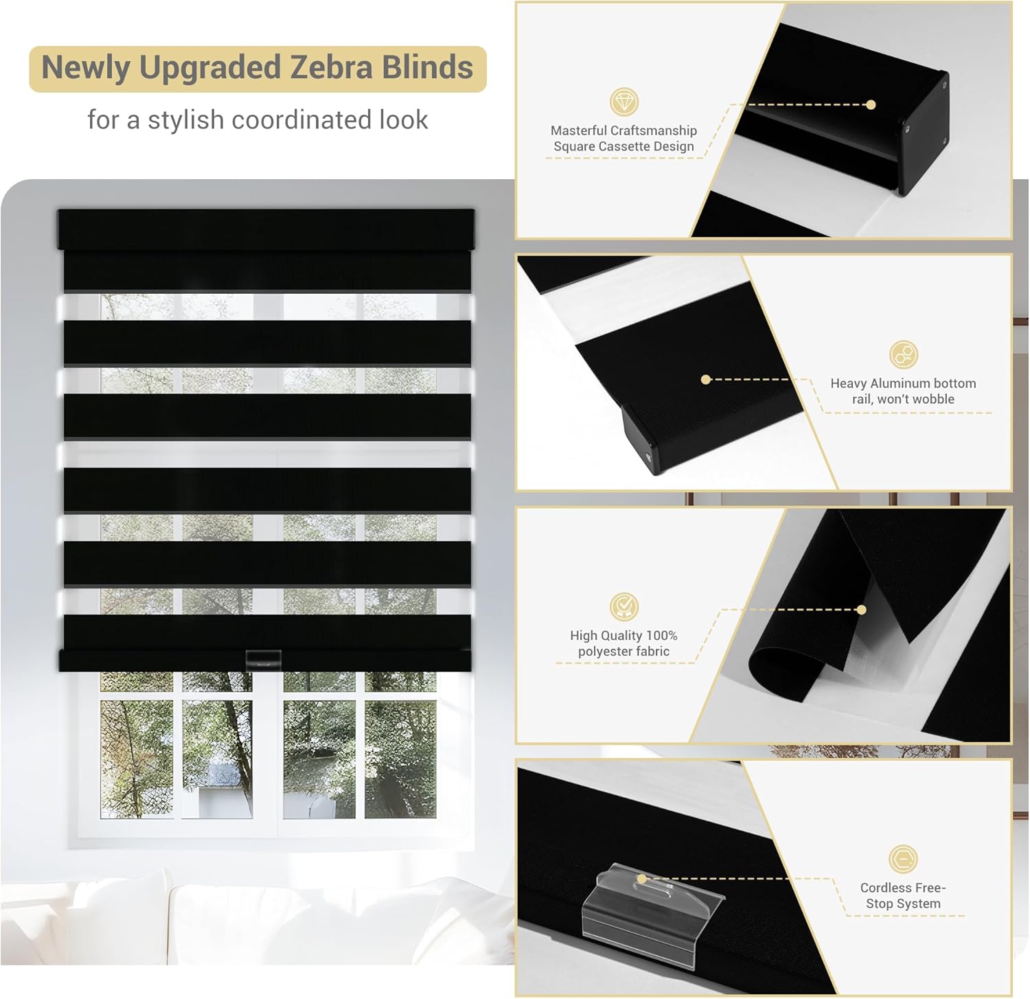 Cordless Zebra Blinds for Windows, Blackout Interior Blinds,Easy to Install,UV Protection,for Offices and Home,Custom Roller Shades, Solid Black, 78" W x 48" H