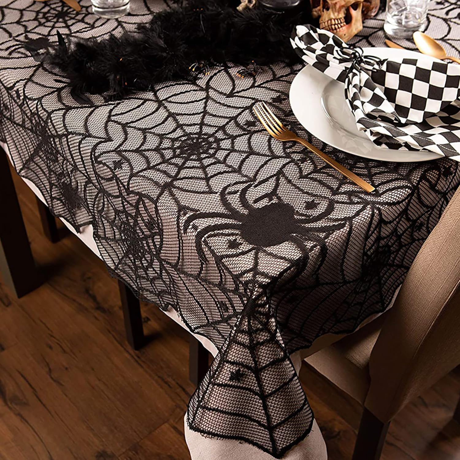 - Unique Design: This Halloween tablecloth features a classic black color scheme, with an elegant spiderweb pattern in the center, surrounded by stars and spiders, creating a mysterious and fun atmosphere.