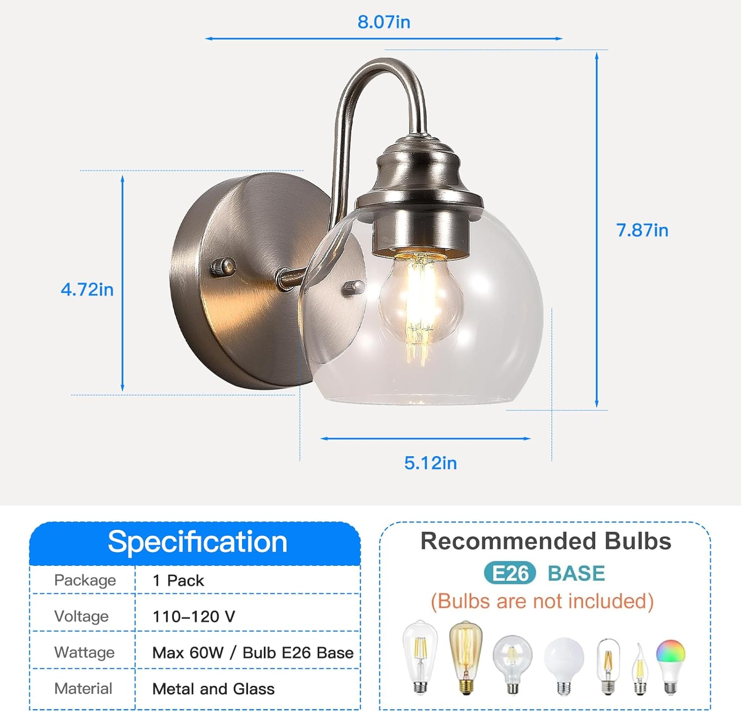 - [Excellent wall lamps]: Two sets of wall lamps are composed of transparent glass lampshades and metal bases. The transparent glass lampshades ensure good light transmittance. The gooseneck design not only restores the classic farmhouse style but also brings a touch of tenderness to your space, making it less rigid. The manufacturing process of brushed nickel metal paint ensures that the wall lamps will not oxidize or fade.