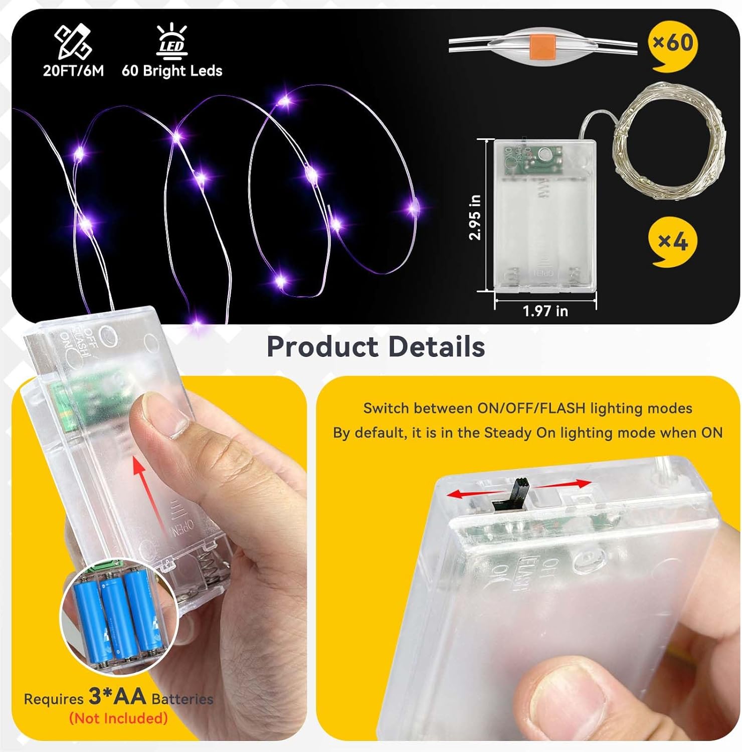 4 Pack 60LED Halloween Fairy Lights Battery Operated - 20FT Twinkle Lights with 2 Lighting Modes Indoor Outdoor, Waterproof Led Fairy String Lights for Christmas, Bedroom, Dorm, DIY Decor, Purple