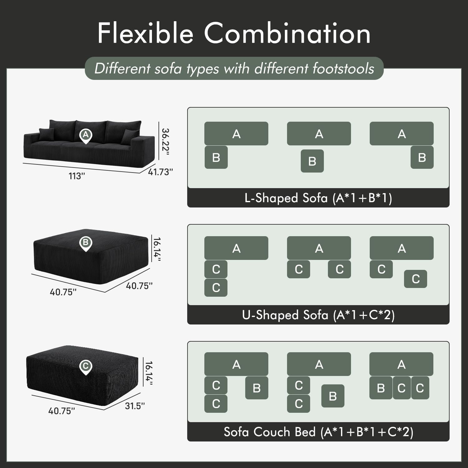 Boneless Sectional Cloud Couch Sofa for Living Room, 112" U-Shaped Modular Modern Lounge Sleeper Black Couches with Chaise, No Assemble, Cordury Compression Upholstered Sofas