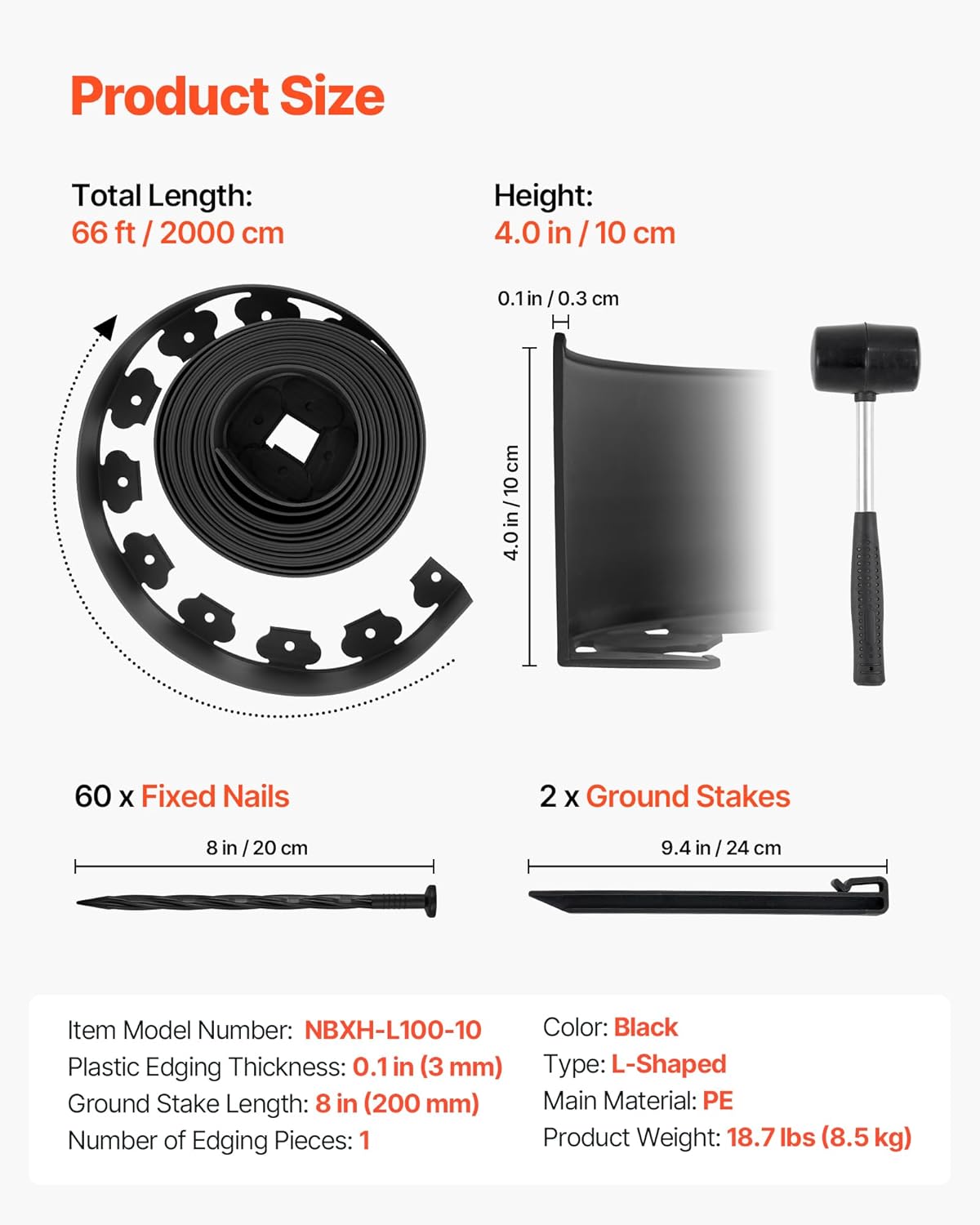 - Complete Accessory Kit: Our garden edging boarder ncludes 60 pcs of 8 in (200 mm) spikes and 2 extra 9.4 in (240 mm) ground stakes for secure anchoring. For optimal performance, install in moist, soft soil.