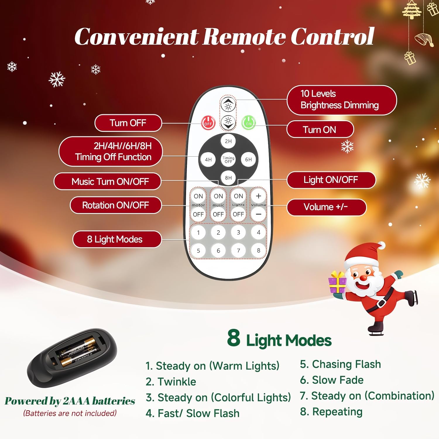 - 360° Rotation & Built-in Music: The 18-inch rotating base allows the tree to gently spin around 360 degrees, showing off its beauty from every angle. Combined with cheerful built-in music, the tree plays a classic Christmas carol, creating a lively and festive atmosphere. Both the music volume and the rotation function can be easily adjusted with the provided remote to suit your mood — turn your tree into the centerpiece of your home’s holiday display.