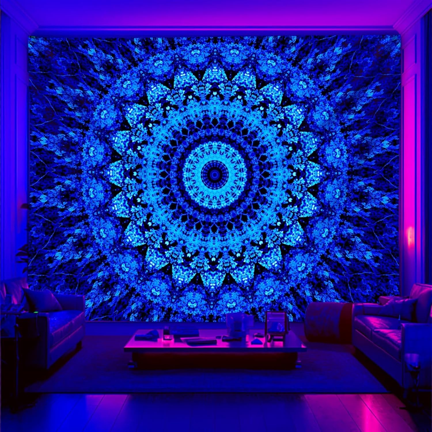 PSYHILAR Blacklight Mandala Tapestry for Bedroom, Black Light Posters for Adults and Teens, Neon UV Reactive Aesthetic Bohemian Wall Art Decor (60 x 50 Inches)