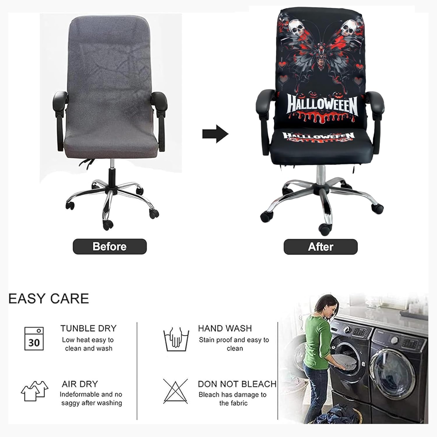 - EASY TO CARE.Our office chair covers are machine washable that only requires very little maintenance. Wash in cold water and gentle cycle separately, tumble dry low, do not bleach or iron. Using mild laundry detergent.
