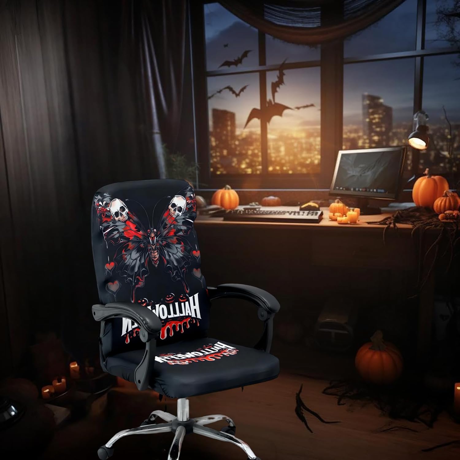- Halloween HOLIDAY DECORTAION DESIGN. Multiple Halloween patterns for choices such as spider, spider web, pumpkin, ghost, terror Bloody Handprint and so on. It refurbish old office chair and durability to add new life to your computer chairs. It's easy to create a Halloween atmosphere.