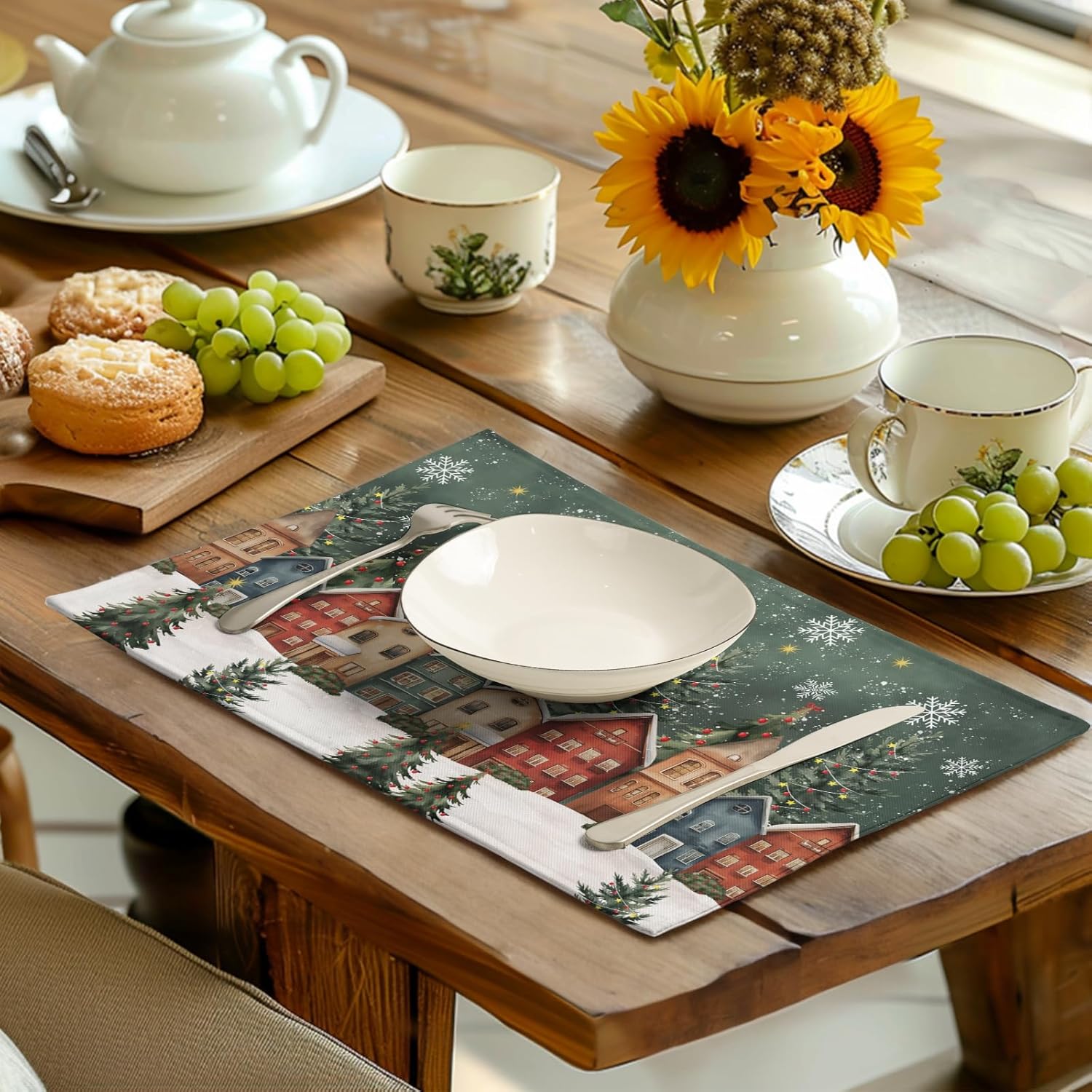 Christmas Placemats 12x18 Inch Set of 4, Winter Xmas Tree Wonderland Forest Village Town House Snowflake Linen Table Mats Washable Place Mats for Party Kitchen Dining Outdoor Indoor Decor