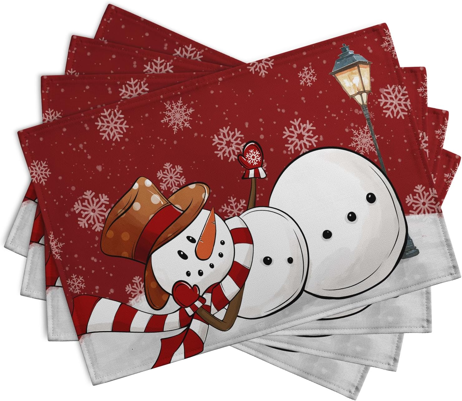- TABLE DECORATION: Red Christmas placemat feature high-definition printing technology for crisp, clear patterns and vibrant colors; rectangle placemats with a red snowman pattern; unique and eye-catching seasonal patterns add charm to farmhouse table place mats, creating a winter and Christmas atmosphere for your party