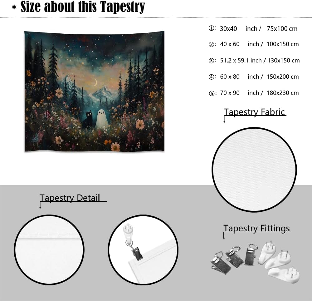 Whimsical Halloween Tapestry Wall Hanging Ghost and Black Cat in Magical Forest Wildflowers Meadow Tapestry Art Print Charming Spooky Fall Season Tapestries for Living Room Bedroom Decor 50x60inch