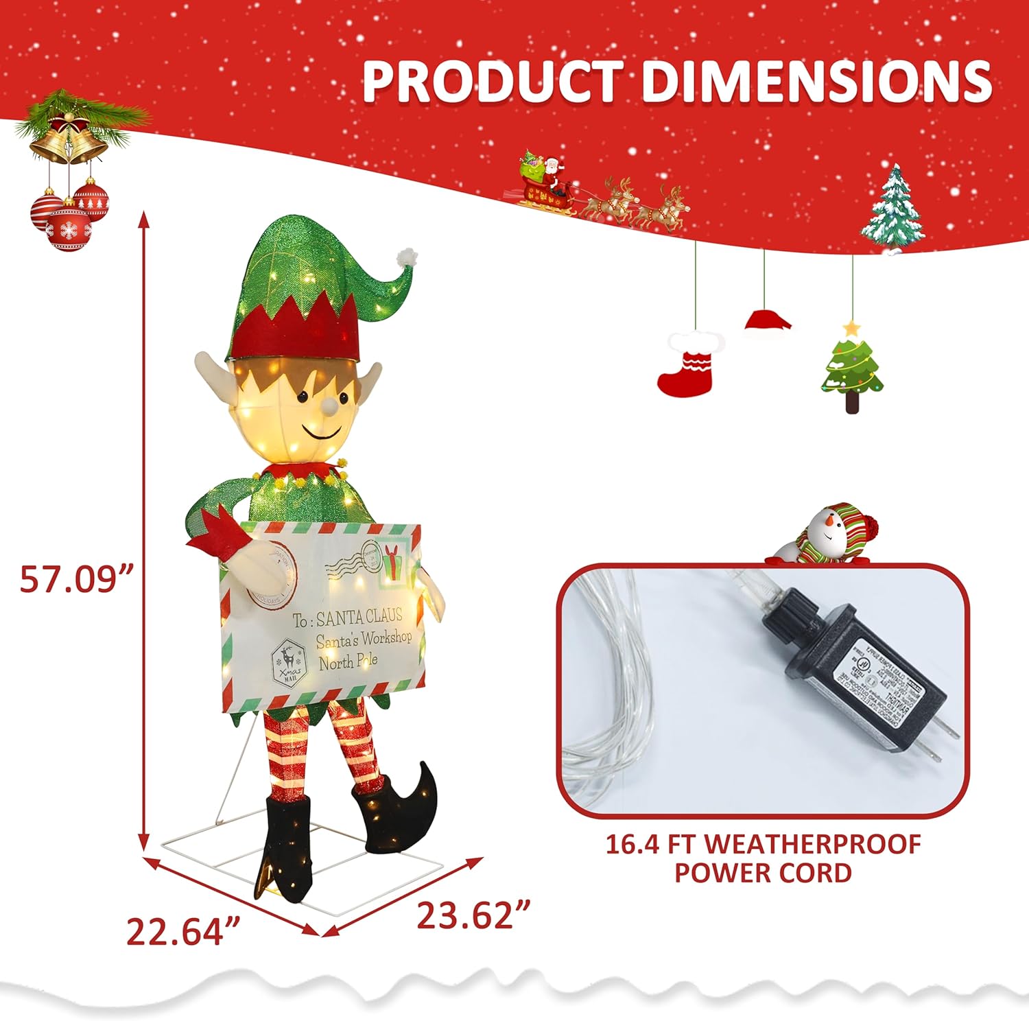 - 3D Pre-Lit Elf Decor: This 4.8FT lighted Elf is a 3D shape which is holding an envelope. They are standing there to welcome your family and friends with their sincerely smile. The 3D design makes the Elf looks more vivid as an outdoor Xmas Decor