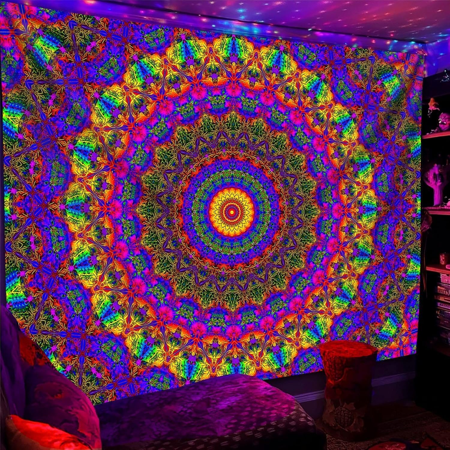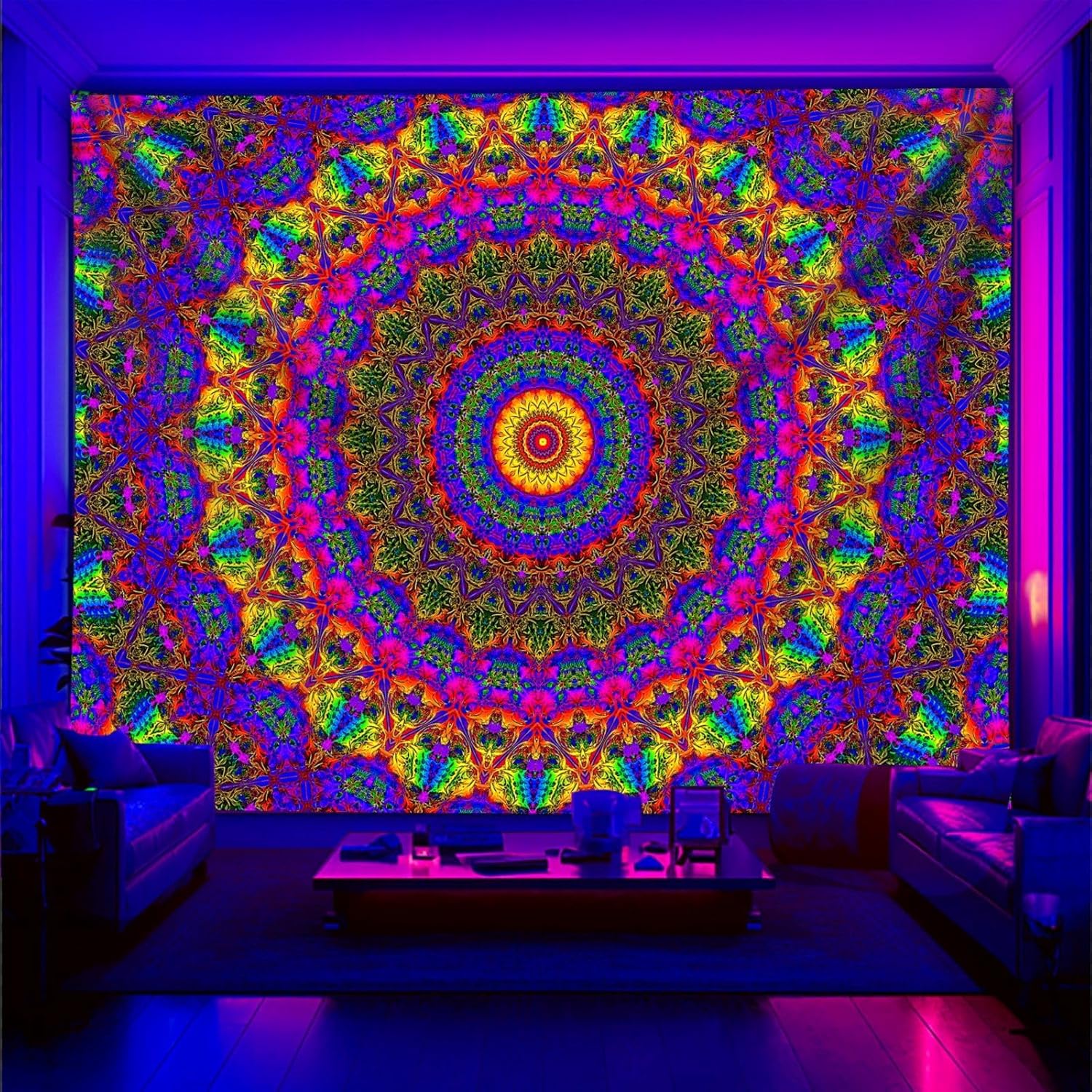 PSYHILAR Blacklight Mandala Boho Tapestry, Black Light Bohemian Hippie Poster for Adults and Teens, Aesthetic Colorful UV Reactive Wall Art Decor for Bedroom (80 x 60 Inches)